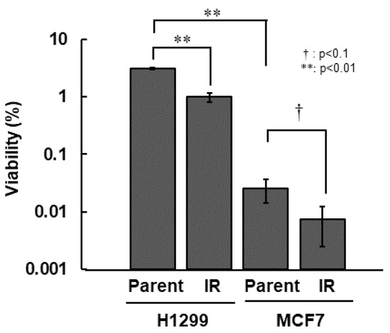 Radio-sensitivity of IR cells. Colony formation assay was performed after 10 Gy irradiation. Cell viability was determined from ratios (%) of viable cells to total numbers of seeded cells. The error bar indicates the standard deviation of the mean of triplicated samples. The double asterisks and the dagger represent statistically significant values of p < 0.01 and p < 0.1, respectively.
