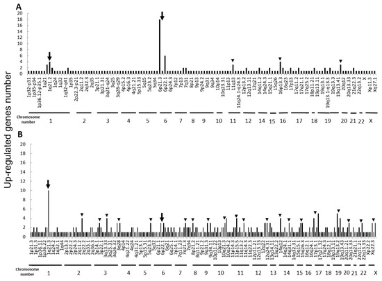 Chromosomal location of up-regulated genes in IR cells from microarray data. Up-regulated gene numbers are displayed on the vertical axis and genome locations from chromosome 1 to chromosome X are plotted along the horizontal axis. (A) The human non-small cell lung cancer cell line H1299. (B) The human breast cancer cell line MCF7. The arrowheads represent chromosomal locations where three or more differentially expressed genes are present, and the arrow represents the loci that are common to both H1299-IR and MCF7-IR cells.