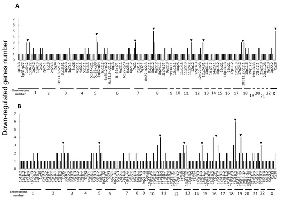 Chromosomal location of down-regulated genes in IR cells from microarray data. (A) The human non-small cell lung cancer cell line H1299. (B) The human breast cancer cell line MCF7. The arrowheads represent chromosomal locations where three or more differentially expressed genes are present.