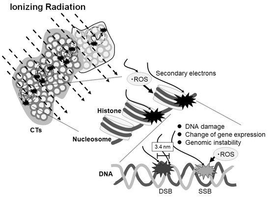 Scheme of the effect of ionizing radiation on DNA damage and gene expression depending on the region of the chromosome territories (CTs). Ionizing radiation stochastically enters the CTs and generates secondary electrons which may cause the reactive oxygen species (ROS). The electrons and ROS can induce single- or double-strand breaks or affect gene expression or genomic stability. DSB and SSB represent double strand break and single strand break, respectively.