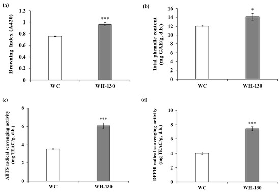 The degree of browning of licorice extracts is shown in Figure 1a. These results confirmed that heat-treated extract (WH-130, 0.965 ± 0.025 A.U. [absorbance units]) had much higher browning index values than non-heated extract (WC, 0.758 ± 0.005 A.U.). We expect that thermal processing increases melanoidin formation in WH-130, and that this change may be linked to various biological activities.