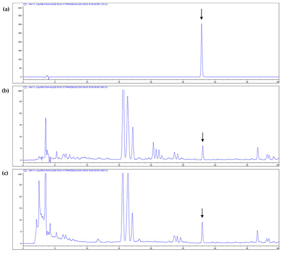 High-performance liquid chromatography (HPLC) chromatograms of isoliquiritigenin and licorice extract: (a) isoliquiritigenin standard, (b) non-heated licorice (WC) and (c) heat-treated licorice (WH-130). Arrows indicate the isoliquiritigenin peak.