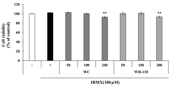 Cell viability associated with licorice extracts (WC and WH-130) was determined using the MTT assay. Data are expressed as mean ± SD (n = 3). ** p < 0.01.