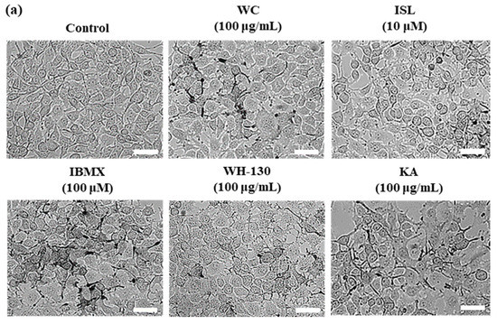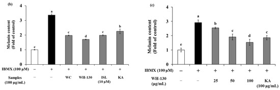 The pigmentation and melanin content of B16F10 cells are shown in Figure 4a,b. Melanin contents of B16F10 cells increased up to 3.4-fold with IBMX treatment relative to the untreated control. WC and WH-130 showed significantly decreased pigmentation and melanin content compared to the IBMX-treated group (Figure 4a,b). Both WC and WH-130 exhibited lower melanin content than KA-treated cells. The inhibitory effect of melanin synthesis in B16F10 cells treated with WH-130 was greater than WC. The amounts of melanin present after treatment with 100 μg/mL WC and WH-130 were reduced to approximately 0.59-fold and 0.51-fold, respectively, of the level in the IBMX-treated group. ISL (10 μM) and KA (100 μg/mL) suppressed melanin production to 0.59-fold and 0.67-fold, respectively of the level in IBMX-treated cells.