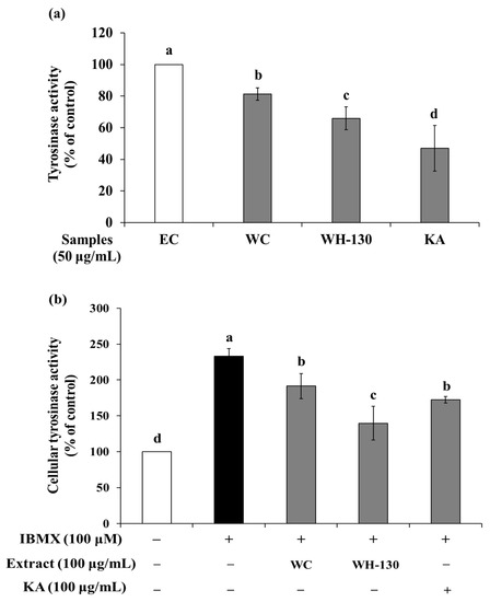 The effect of licorice extracts on mushroom TYR activity is shown in Figure 5a. We confirmed that the effect of the extracts (WC and WH-130) on the oxidation of substrates by mushroom TYR occurred in cell-free conditions. At 50 μg/mL, WC extract inhibited enzyme activity to 81.33%, while WH-130 suppressed TYR activity to 65.95% of the EC level. Meanwhile, kojic acid (KA), a TYR inhibitor, caused inhibition of enzyme activity to 47.09% of the EC level. The inhibition of TYR activity was greater in heat-treated licorice (WH-130) than in non-heated licorice (WC).