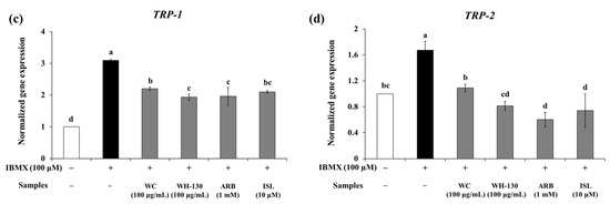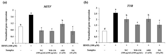 As shown in Figure 7b, treatment with WC and WH-130 significantly reduced the protein expression levels of MITF, TYR, TRP-1 and TRP-2. Expression levels of MITF, TYR, TRP-1 and TRP-2 were suppressed in cells treated with WC (0.79-fold, 0.86-fold, 0.89-fold and 0.67-fold, respectively, relative to IBMX-treated cells). WH-130 showed reduced protein expression levels of MITF, TYR, TRP-1 and TRP-2 (0.74-fold, 0.73-fold, 0.80-fold and 0.48-fold, respectively, relative to IBMX-treated cells). ISL decreased the protein expression levels of MITF, TYR and TRP-2 (0.76-fold, 0.83-fold and 0.41-fold, respectively, relative to IBMX-treated cells). WH-130 suppressed the protein expression of melanogenesis-related genes more strongly than WC, showing that licorice extracts inhibit melanogenesis via suppression of the translation of melanogenesis-related genes and that heat treatment improves the anti-melanogenic activity of licorice extract.