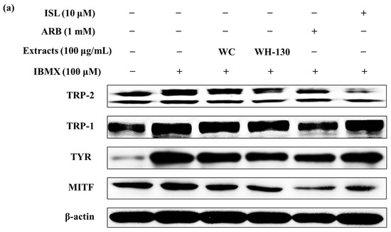 B16F10 cells were seeded in 6-well plates at a density of 8 × 104 cells per well, incubated for 24 h and then exposed to extracts (100 μg/mL), kojic acid (100 μg/mL) or ISL (10 μM) for 48 h. After washing with DPBS, cells were harvested and lysed in Triton X-100 buffer (MilliporeSigma, Burlington, MA, USA) containing 1% protease and phosphatase inhibitor cocktail. The protein concentrations of whole-cell lysates were measured using a BCA assay kit (Waltham, MA, USA). Equal amounts of protein (20 μg) were loaded onto 10% sodium dodecyl sulfate polyacrylamide gels, which were run for 4 h at 70 V. Then, the proteins were transferred to a polyvinylidene fluoride (PVDF) membrane. The membrane was washed three times with Tris-buffered saline [50 mM Tris-HCl (pH 7.5), 150 mM NaCl] containing 0.1% Tween 20 (TBST) and blocked with 2% bovine serum albumin (GenDEPOT) for 1 h. Next, the membranes were incubated overnight at 4 °C with the primary antibodies (dilution 1:1000) for 4 h at room temperature. MITF, TYR, TRP-1, TPR-2 and β-actin were detected with rabbit polyclonal anti-MITF antibody (Abcam, Cambridge, UK); goat polyclonal anti-TYR antibody (Santa Cruz, Dallas, TX, USA); and mouse monoclonal anti-TRP-1, anti-TRP-2 and anti-β-actin antibodies (Santa Cruz, Dallas, TX, USA), respectively. Afterward, the membranes were washed several times with TBST and incubated with secondary antibodies (dilution 1:2000) for 1 h, namely rabbit anti-mouse IgG, mouse anti-goat IgG and goat anti-mouse IgG (Santa Cruz, Dallas, TX, USA), followed by several washes with TBST. Target proteins were detected using an enhanced chemiluminescence (ECL) reagent (Bio-Rad, Hercules, CA, USA) with the ChemiDoc Imaging System (Bio-Rad, Hercules, CA, USA). Protein band quantification was conducted using ImageJ software (version 1.52a for Windows; NIH, Rockville, MD, USA) [28].