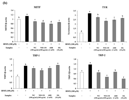 Effects of licorice extracts (WC and WH-130) on the expression of melanogenesis-related proteins in B16F10 cells. Cells were treated with licorice extracts (WC and WH-130), arbutin (ARB, 1 mM) and isoliquiritigenin (ISL, 10 μM) for 48 h. (a) Expression levels of proteins including MITF, TYR, TRP-1 and TRP-2 were determined through a western blotting assay (densitometric data). Equal protein loading was confirmed with β-actin as a housekeeping protein. (b) Values are presented as mean ± SD from three experimental replicates. Significance was statistically defined with small letters at p < 0.05.