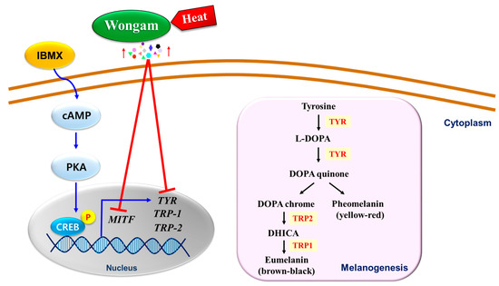 Schematic model of anti-melanogenic effects of heated Wongam in B16F10 melanoma cells. The red line and blue arrows indicate inhibition and stimulation, respectively. Heat treatment can increase the content of phenolic compounds such as ISL, linked to anti-melanogenic activities via regulating melanogenesis-related genes and proteins, in licorice.