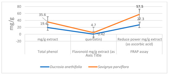 Total content of phenolics (TPC) and flavonoids (TFC) were estimated in D. flabellifolia and S. parviflora plant extracts using a colorimetric assay according to [18] based on procedures described by [19] and [20], respectively. The total phenolic compounds were illustrated as mg/g gallic acid equivalent (GAE). Total flavonoid content (mg/g) was measured using a calibration curve of quercetin and illustrated as mg quercetin equivalents. The antioxidant activity of the extracts collected has been studied according to the methods described by [21] with minor modifications as applied by [22]. Briefly, methanolic extracts of D. flabellifolia and S. parviflora in various concentrations (100–500 μL) were mixed separately with 2.5 mL of 0.2 mM PBS (pH 7.4) and 2.5 mL of potassium ferricyanide (1% w/v). This mixture was incubated at 500 °C for 20 min. Then, 2.5 mL of trichloroacetic acid (10% w/v) was added and centrifuged at 3500 rpm for 8 min, followed by 2.5 mL of distilled water and later 0.5 mL of ferrous chloride (0.1% w/v). The absorbance at 700 nm was estimated. As a positive reference standard, ascorbic acid was utilized.