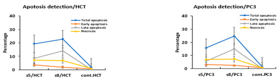 Figure 3. Effects of IC50 concentrations of D. flabellifolia (S5) and S. parviflora (S8) on the induction of apoptosis among HCT-116 and PC3 cell lines.