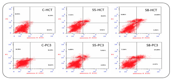 Figure 4. Induction of apoptosis among HCT-116 and PC3 cell lines in response to treatment with IC50 of D. flabellifolia (S5) and S. parviflora (S8) extracts in comparison with controls (C).