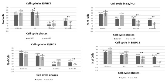 Figure 5. Cell cycle analysis of HCT-116 and PC3 cell lines in response to treatment with IC50 of D. flabellifolia (S5) and S. parviflora (S8) extracts in comparison with controls (C). Statistically significant indicated by * p-value < 0.05 and highly significant indicated by ** p-value < 0.01.