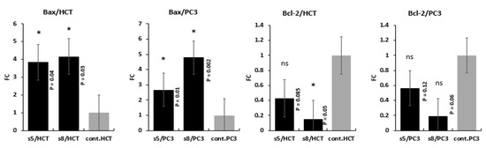 Figure 6. Changes in mRNA levels of Bax and Bcl-2 genes among HCT-116 and PC3 cell lines in response to treatment with IC50 of D. flabellifolia (S5) and S. parviflora (S8) extracts in comparison with controls (C). * p-value < 0.05; ns = non significant.
