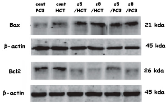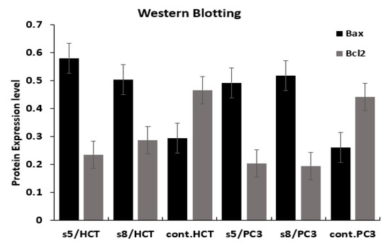 Figure 7. Changes in protein levels of Bax and Bcl-2 genes among HCT-116 and PC3 cell lines in response to treatment with IC50 of D. flabellifolia (S5) and S. parviflora (S8) extracts in comparison with controls (C).
