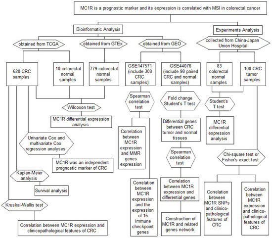 R scripts/Bioconductor packages, SPSS 25.0, and GraphPad Prism 8.0 were used for statistical data analyses and figures. We performed univariate Cox analysis and multivariate Cox regression analysis to investigate whether MC1R can effectively predict the prognosis of CRC. The Wilcoxon test and Kruskal–Wallis test were used to compare MC1R expression in different groups. After dividing CRC patients into the MC1R high-expression group and MC1R low-expression group, we constructed survival curves of CRC by Kaplan–Meier analysis. Student’s t test was used to analyze the data for MC1R expression, which we detected using the Western blotting assay and RT-qPCR assay. The correlations between MC1R and the clinicopathological features and the correlations between MC1R SNPs and the clinicopathological features were examined by chi-square test or Fisher’s exact test. The correlation between MC1R expression and targets of interest, including MMR genes, the tumor microenvironment, immune checkpoint genes, immune cells, and differential genes, was evaluated by the Spearman correlation test. All statistical results with p < 0.05 were considered to be statistically significant. The data collection and method implementation in this study were summarized in flowchart (Figure 1).