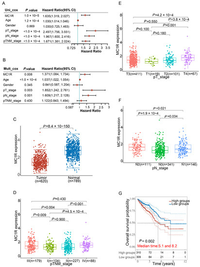 3.1. MC1R Is an Independent Marker for CRC Prognosis, and High MC1R Expression Is Associated with Advanced T, N, and TNM Stage