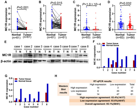 In this part, we examine the expression of MC1R at the protein and mRNA levels in 86 CRC tumor tissues and 83 adjacent normal tissues by RT-PCR and Western blotting, respectively. The data for MC1R expression were analyzed with Student’s t test, and the results showed that both the expression of MC1R at the protein and mRNA levels were significantly lower in CRC tumor samples (N = 61) than in paired normal tissues (p < 0.05) (Figure 3A,B). The trend of downregulation was also observed when comparing unpaired tumor samples and all normal samples (p < 0.05) (Figure 3C,D). Here, we present the detection results of eight more representative cases (Figure 3E–G). Forty-seven (77.0%) and forty-four (72.1%) cases showed that MC1R was expressed at lower levels in CRC tumor samples than in normal tissue by RT-qPCR and Western blotting, respectively. In addition, the overall agreement was 95.1% (58/61) (Figure 3H). Although the two approaches had different truncation points, their tendency of MC1R expression was the same, and both indicated that MC1R was expressed at lower levels in CRC tumor samples than in normal samples.