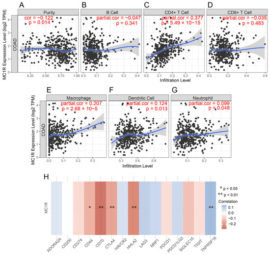 Immunological features related to MC1R in CRC. Correlation analysis of MC1R expression and infiltration of immune cells in CRC in the TCGA cohort. (A) Tumor purity, (B) B cells, (C) CD4+ T cells, (D) CD8+ T cells, (E) macrophages, (F) neutrophils, and (G) dendritic cells relative to MC1R expression. (H) Correlation between MC1R expression and the expression of 15 immune checkpoint genes.