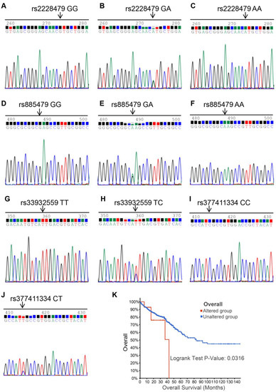 Chromatograph of sequencing of MC1R coding sequence. (A) homozygotic type of SNP locus rs2228479; (B) and (C) heterozygous type of SNP locus rs2228479; (D) homozygotic type of SNP locus rs885479; (E) and (F) heterozygous type of SNP locus rs885479; (G) homozygotic type of SNP locus rs33932559; (H) heterozygous type of SNP locus rs33932559; (I) homozygotic type of SNP locus rs377411334; (J) heterozygous type of SNP locus rs377411334. (K) Overall survival of 15 MC1R altered group and 1476 MC1R unaltered group patients in the Kaplan–Meier Plotter.