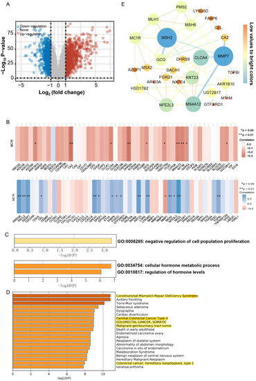 Gene Set Enrichment Analysis of MC1R in CRC. (A) Volcano plots were constructed using fold-change values and adjusted P. (B) Heat map of the correlation between MC1R and differential genes. The correlation between MC1R and the 50 upregulated genes with the largest difference change (above). The correlation between MC1R and the 50 downregulated genes with the largest difference change (below). (C) GO enrichment analysis for positively associated differential genes (above); GO enrichment analysis for adversely associated differential genes (below). (D) Summary of enrichment analysis in DisGeNET12 for MC1R and associated differential genes and four MMR genes. (E) The network for MC1R, four MMR genes, and the 26 correlated differential genes. In this figure, the size and gradient color of the node are adjusted by degree, and the edge thickness and gradient color are adjusted by the combined score.