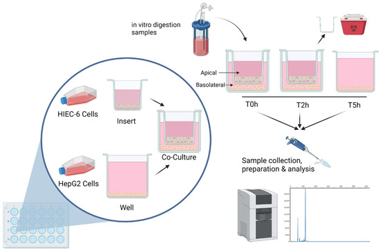 Assessment of first pass metabolism in cell culture. HIEC-6 and HepG2 cells were seeded in a 24-well transwell plate. Freeze-dried gastrointestinal digesta from a simulated digestion model were applied to the apical compartment of the co-culture and incubated for 2 h. The transwell insert was removed and the incubation continued for another 3 h. Subsamples from the apical and basolateral side were taken at times 0, 2 and 5 h, followed by peptide analysis using capillary electrophoresis. Figure created with BioRender.com.