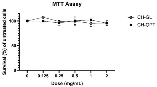 Cell survival (%) using (3-[4,5-dimethylthiazol-2-yl]-2,5-diphenyl tetrazolium bromide) (MTT) method on HIEC-6 cells. A two-way ANOVA, using dose and treatment as factors, followed by Tukey-HSD was completed where differences were considered significant if p < 0.05. No significant differences between CH doses or treatments were observed.