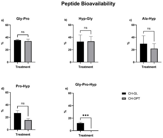 Bioavailability of CH-GL and CH-OPT peptides after first pass metabolism: (a) Gly-Pro; (b) Hyp-Gly; (c) Ala-Hyp; (d) Pro-Hyp; and (e) Gly-Pro-Hyp. Values are expressed as the final peptide content after hepatic effect as a percentage of initial digesta values. For each peptide, a t-test was completed to determine the effect of CH treatment, where differences were considered significant if p < 0.05. Columns with asterisks are significantly different (*** p < 0.001). Columns with ns are not significantly different.