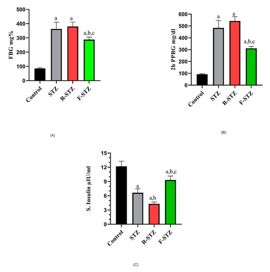 Blood glucose estimation in different experimental groups (A) FBG (mg/dl); (B) 2 h postprandial blood glucose (mg/dl); (C) Fasting serum insulin level (μIU/ml) in the different studied groups. (a) Significant difference from normal control group at p < 0.05; (b) Significant difference from STZ group at p < 0.05; (c) Significant difference from R-STZ group at p < 0.05.