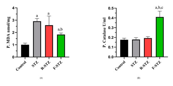 A dramatic increase in pancreatic MDA level in diabetic rats of the three STZ-treated groups was observed, with much more elevation (p < 0.05) in STZ control and rapamycin group over the level in fasting diabetic rats (Figure 2A). Restoration of the antioxidant capacity presented as CAT in the F-STZ in comparison to the control and STZ group (Figure 2B).