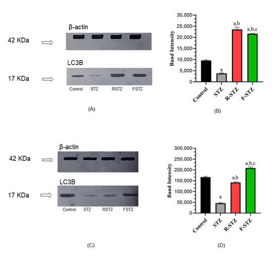 Protein expression of the autophagy marker LC3B, measured by WB, presented in Figure 3 was determined in pancreatic (Figure 3A,B) and renal tissues (Figure 3C,D) density and band intensity, that revealed a significant increase (p < 0.05) in rats’ tissues subjected to stress either by dietary restriction as fasting or mTOR inhibition via rapamycin administration to the R-STZ group, compared to rats of the normal control group. In contrast, rats subjected only to STZ showed a significant decrease of LC3B in comparison to the control group.