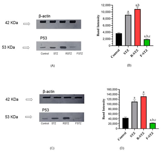 The apoptotic marker p53 expression level density and band intensity (Figure 4), measured by WB, in the pancreatic (Figure 4A,B) and kidney tissue (Figure 4C,D) samples of rats treated with rapamycin was the highest among the rest of study groups, with significant increase (p < 0.05) from the control and fasting groups. Unlike expected, the p53 level in rats subjected to fasting was significantly low, compared to the normal control group.
