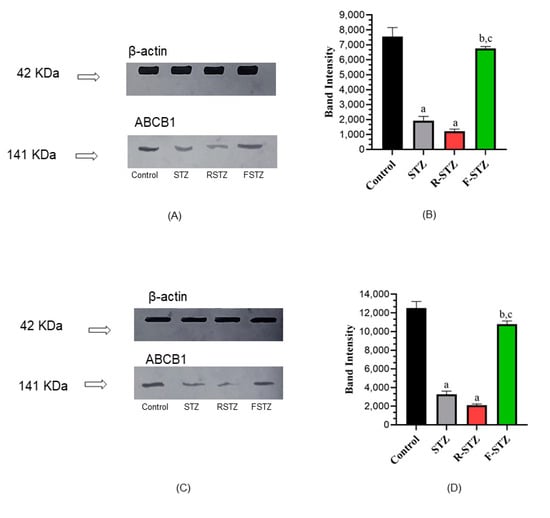 In the current study (Figure 5), the three STZ treated groups showed low level of ABCB1 protein in either the pancreatic (Figure 5A,B) or the renal tissues (Figure 5C,D), with reference to the control group. However, the difference in the fasting group was non-significant compared with R-STZ treated group that exhibited a significant difference (p < 0.05) from the control group.