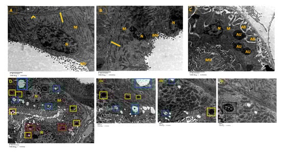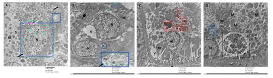 Selected micrographs by TEM of renal cells in the fasting group exhibited the four sequential steps in the autophagy process which are initiation and formation of isolation membrane (blue square) in (A), formation of autophagosomes (blue square) in (B), fusion of autophagosome with lysosome (red square) in (C), and maturation of autophagosomes into autolysosomes (black square) in (D). Signs of apoptosis were absent as there were no apoptotic bodies nor chromatin condensed at the periphery of the nucleus (N). In addition, newly formed mitochondria (M) were numerous, cytoplasmic space (S) were mostly in (A), and vacuoles (V) were observed in (A,B), while in (C) the cytoplasmic space (S) and the vacuoles (V) were less abundant.