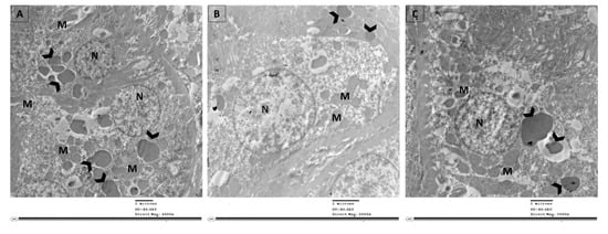 Selected micrographs by TEM of renal cells in the STZ group demonstrated active apoptosis with absence of autophagy. Active apoptosis appeared as apoptotic bodies (arrowhead) which are packages of fragmented intracellular components. Cytoplasmic gaps and swollen or irregular mitochondria (M) were abundant. (A) Apoptotic bodies (arrowhead) are mainly the results of splitting of the cellular content into distinct membrane-enclosed vesicles. (B) Apoptotic bodies as the result of plasma membrane blebbing (arrowhead). (C) Empty cytoplasm along with apoptotic bodies of larger size (arrowhead) and in close approximation to the nucleus (N) suggest inclusion of macromolecules such as proteins, lipids, RNA, and DNA.