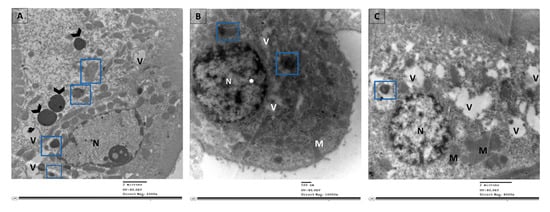 Selected micrographs by TEM of renal cells in the rapamycin groups displayed augmented apoptosis with little autophagy. Augmented apoptosis was evident as the chromatin condenses at the periphery of the nucleus (N) in addition to the abundance of apoptotic bodies (arrowhead) and vacuoles (V). The autophagic dynamic was disrupted as there were few phagocytic vesicles stuck as autophagosomes (blue square) with no autolysosomes. (A) A cellular behavior distinctive of apoptosis involves advanced margination and compacting of chromatin under the nuclear membrane, apoptotic bodies (arrowhead) and vacuoles (V). In addition, few autophagosomes (blue square) are found. (B) The collapse of cytoskeleton is indicated by diminished cell and shrunken nucleus (N), with an abundance of few number of vacuoles (V) and autophagosomes (blue square). (C) Atrophied nucleus with nuclear pores appears close to the areas of compact chromatin, extensive vacuolation (V) of the cytoplasm, fused mitochondria (M), and scarce autophagosomes (blue square).
