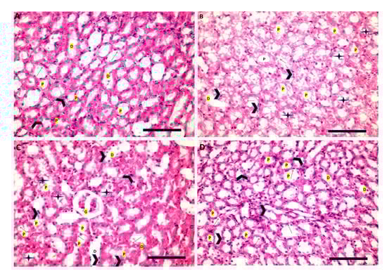 Sections of renal cells from the control group showed normal architecture of proximal tubules (P), with intact brush border and vesicular nuclei (Figure 10A). On the other hand, examination of renal cells of the STZ rats, showed atrophied proximal and distal tubules (D), with pyknotic nuclei (Figure 10B). The renal cells of R-STZ group showed diffuse atypical glomerulus (G), necrotic vacuolated epithelial cells of proximal and distal tubules (Figure 10C). However, in the F-STZ group the proximal tubules recovered with normal brush border and vesicular nuclei (Figure 10D).