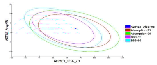 A compound absorbed through the gastrointestinal tract to be available in circulation, metabolized by metabolic enzymes to be excreted from the body, and does not interfere with normal biological processes, is considered to possess a good ADME profile [74]. Aqueous solubility predicted using a linear regression model in water at 25 °C was at level “2” indicating moderate solubility. Moderate distribution and permeability for yohimbine was assessed based on the predicted value of distribution coefficient D. Distribution coefficient P estimated for yohimbine revealed it to be an optimal lipid bilayer permeable. All the values associated with absorption, such as Papp (Caco-2 Permeability), Pgp-inhibitor (P-glycoprotein inhibitor), PgP-substrate, human intestinal absorption, and bioavailability indicated its good absorption. Parameters calculated to assess distribution properties of the yohimbine revealed it to distribute evenly and bind to tissues such as proteins and lipids and is highly lipophilic, as shown by good plasma protein binding (PPB), volume distribution (VD), and blood–brain barrier (BBB). A compound crossing the blood–brain barrier (BBB) is not considered safe for administration. BBB penetration level was predicted for yohimbine, indicating medium penetration. ADME model that uses 2D PSA and AlogP98 descriptors with 95% and 99% confidence ellipses were applied to predict intestinal absorption and blood–brain barrier penetration. The enclosed region within these ellipses defines the well-absorbed compounds region [42]. Drug metabolism depends upon CYP450 (cytochrome 450) enzymes and their isoforms. Since these enzymes are responsible for detoxification, molecules inhibiting these enzymes can cause toxicity [75]. In the liver, CYP2D6 accounts for only 2% of the total CYP content, however, it is responsible for the biotransformation of 20% of the drugs that undergo hepatic metabolism. The CYP2D6 inhibitors are lipophilic to a moderate degree. It was discovered that there are 57 different CYP isoforms in mammals, all of which are involved in the breakdown of certain molecules, including xenobiotics and endogenous compounds via oxidative metabolism. Clinical drug metabolism is carried out majorly by five CYP isoforms (3A4, 2D6, 2C19, 2C9, and 1A2) which are involved in the metabolism of more than 80 percent of the drugs used in clinical trials. Since yohimbine became an inhibitor of CYP2D6, it may impede the biotransformation of drugs metabolized by CYP450 enzyme. Calculation of other important ADME properties of yohimbine is listed in Table 1 and Table 2. Yohimbine falls inside the ellipses filter describing its good intestinal absorption and medium BBB penetration as shown in Figure 2. Yohimbine toxicity screening through TOPKAT and ADMETlab shows that predicted carcinogenicity values are within the expected range, and the compound possesses no risk of mutagenicity. However, it shows mild skin irritancy, severe ocular irritancy, and if consumed for long term or at high doses, it may impose developmental or reproductive toxicity in humans. Other toxicity screening parameters, including Rat inhalation LC50, Rate of Oral LD50, Rat chronic LOEAL, Daphnia EC50, and Fathead minnow LC50 are summarized in Table 3.