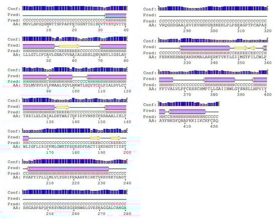 Figure 3. Secondary structures of 5HT1A retrieved through Psi-Pred shows presence of 42.65% helices as shown in pink cylinder, 52.13% sheets as shown in yellow arrow, and 6.87% loops as solid black connecting line.