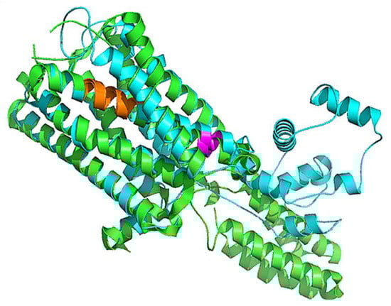 Figure 4. Superimposed structure of 5HT1A best model (cyan color) over the template structure of 4IAR_A (green color) in cartoon representation with 0.66 Å RMSD. Highly conserved agonist binding domains are shown in orange and magenta colors.