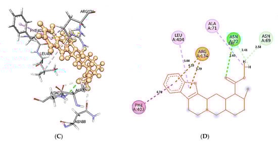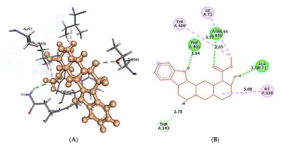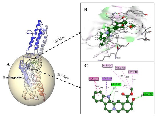 The binding pocket of the TP model predicted by the module ‘PDB Site Records’ in the “Define Site” protocol from DS was selected for docking procedure using the GOLD suite (https://www.ccdc.cam.ac.uk/solutions/csd-discovery/Components/Gold/ (accessed on 1 May 2021)) [66]. TP structure was prepared, and a cavity of 10 Å radius with XYZ coordinates of −25.479000, −5.895000, and 45.678000, respectively, was set around the predicted binding pocket. For predicting the best ligand binding pose, Gold Fitness Score was selected to measure and rank the ligand conformations. yohimbine was docked in the binding pocket using the GOLD Suite. Intra-molecular interactions formed within the docked complex were analyzed with ‘View Interactions’ tool from DS.
