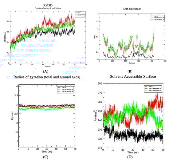 For a comprehensive study of the effects of mutations on the 5HT1A structure, all-atom MD simulations were carried out for 60 ns under explicit water solvent conditions. MD Simulation was carried out with the GROMACS 4.6.5 (http://www.gromacs.org/ (accessed on 3 March 2021)) simulation suite at 300 K at the molecular mechanics level using the CHARMM36 force field to understand the factors behind the efficiency of yohimbine in inhibiting 5HT1A [67,68,69]. All systems, including 5HT1A and the complex of wild type 5HT1A with yohimbine, and mutant 5HT1A with yohimbine, were submerged in a dodecahedron box a simple point charge (SPC) water model [70] filled with water molecules, with borders defined using the gmx editconf module and salvation provided by the gmx solvate module. Further, gmx genion module was applied to neutralize the system by incorporating Na+ (sodium) and Cl (chloride) and preserving a physiological concentration at 0.15 M. The systems were subjected to 5000 steps of steepest descent minimization to eliminate any steric conflicts. This process was repeated until the maximum force of less than 1000 kJ/mol/nm was reached. All of the systems were further equilibrated at a constant temperature of 300 K and a pressure of 1 bar by deploying NVT using the V-rescale thermostat and NPT using the Parrinello–Rahman barostat ensemble process for 100 ps at a constant temperature of 300 K and a pressure of 1 bar [71,72]. A total of three MD simulations were performed for (i) 5HT1A modeled structure, (ii) 5HT1A modeled structure docked with yohimbine (5HT1AComplex_W), and (iii) 5HT1A mutant structure (N404L) docked with yohimbine (5HT1AComplex_M). Final simulation for each system was performed for 60 ns using a leapfrog integrator to acquire the time evolution of trajectories [73]. The resulting trajectories were analyzed using gmx rms, gmx rmsf, gmx sasa, gmx gyrate, and gms trjconv modules of GROMACS. The outputs were plotted into graphs using X-GRACE (GRaphing Advanced Computation and Exploration of data), and the coordinates retrieved at specific intervals were analyzed in Discovery Studio Visualizer.