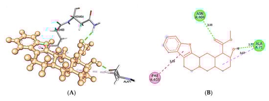 At 50 ns, Asn72, Asn404, Phe403, and Ala71 wild type 5HT1A structures are forming H-bonds with yohimbine. HD21 of Asn72 forms a conventional H-bond by donating an electron pair to the O3 atom of yohimbine at a distance of 2.8 Å. HD21 of Asn404 forms conventional H-bond at a distance of 1.89 Å with O3 of yohimbine by donating an electron pair. However, the O atom of Phe403 and Ala71 forms H-bond with H18 and H19 atom of yohimbine by accepting an electron pair at distances of 1.71 and 1.91 Å, respectively. Whereas, mutant 5HT1A forms only one conventional H-bond with yohimbine between HD22 atom of Asn72 and O3 atom of yohimbine by donating an electron pair at a distance of 2.6 Å. In addition, Leu404 is forming hydrophobic interactions with yohimbine, as shown in Figure 13.