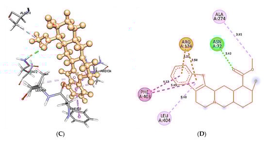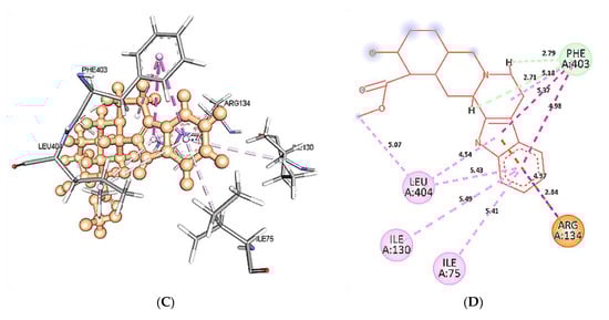 Figure 14. Intra-molecular interactions formed between docked complexes at 60 ns of MD simulation. (A,B) shows hydrophobic bonds in pink dashed line, where yohimbine is presented in ball and stick while the interacting residues of wild type 5HT1A are shown in sticks. The figures are prepared in Discovery Studio Client V 20.1, in 3D and 2D formats, respectively. (C,D) shows interaction between mutant 5HT1A and yohimbine in 3D and 2D representations.