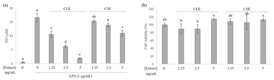 To measure anti-inflammatory activity by NO assay, RAW 264.7 cells were seeded at 1 × 105 cells/well in 96-well plates and incubated for 24 h. The cells were then treated with various concentrations of CSE (1.25, 2.5, 5 mg/mL) and CLE (1.25, 2.5, 5 mg/mL) for 1 h. Subsequently, LPS (0 or 1 µg/mL) was administered to the cells, which were then incubated for 24 h. NO production in the supernatant was evaluated by nitrite measurement based on the manufacturer’s protocol. In brief, an equal volume of supernatant and Griess reagent were mixed and incubated for 10 min at ambient temperature in the dark, and the absorbance was measured at 570 nm by a Synergy HT microplate reader from Bio-Tek Instruments Inc. (Winooski, VT, USA).