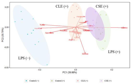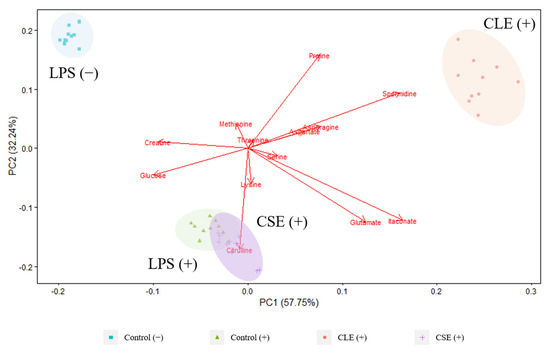 PCA biplot derived from LC-MS-targeted analysis of culture medium from different treatment groups. (+) and (−) refer to LPS-stimulated and unstimulated cells, respectively. Red arrows represent metabolite loading vectors, and their distance from the origin indicates the extent of their influence on the PCs.