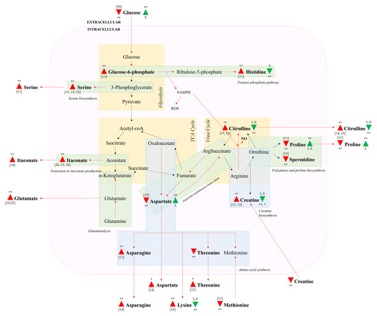 The intracellular and extracellular metabolites responsible for the differences between LPS-stimulated and unstimulated cells (t-test, p < 0.05) are presented in Figure 4a,b. Intracellular proline, aspartate, spermidine, and threonine levels were decreased with LPS stimulation, while citrulline, creatine, serine, glucose-6-phosphate, itaconate, asparagine and histidine levels were elevated. Conversely, extracellular creatine, glucose, methionine and proline levels were lower in LPS-stimulated media, while citrulline, itaconate, serine, glutamate, aspartate, lysine and threonine were present at higher concentrations. Most of these findings have been reported previously, with the respective references for individual metabolites listed in Figure 5. It was noted that celery treatment enabled the reversal of some metabolite changes induced by LPS. Intracellular citrulline, proline and creatine were reversed by both CLE and CSE treatments, while aspartate and histidine were individually reversed by CLE and CSE treatments, respectively. Extracellular citrulline and lysine were reversed by both CLE and CSE treatments, while proline and glucose were individually reversed by CLE and CSE treatments, respectively.