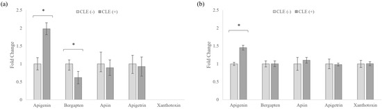 Among the flavonoids, apigenin has demonstrated the strongest inhibition of NO production in LPS-stimulated RAW 264.7 cells at 10 µM [6], which may provide evidence of its role in mediating LPS suppression. It was also noted that apiin and apigetrin, which could potentially hydrolyze to apigenin, showed consistent levels in both cells and media, indicating that the increase in apigenin was not due to degradation. Furthermore, as macrophages are not expected to produce apigenin naturally, it was likely that less apigenin was metabolized by the cells during LPS-stimulation. The reduced metabolism of apigenin, however, does not invalidate it as a contributor to the reduced inflammatory response, and future work outside the scope of this paper may seek to clarify the mechanism involved. Between the coumarins, bergapten has been reported to suppress NO production in LPS-stimulated RAW264.7 cells at 1 µM [38], which is lower than its isomer xanthotoxin, which required 25 µM [39]. As such, while xanthotoxin was below the detection limit in the cells, it is expected that bergapten would be more responsible for the suppression of NO production. These results indicate that apigenin and bergapten may be potential mediators of the anti-inflammatory response in CLE.