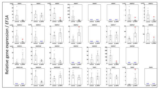 Effect of E2 + MPA treatment on MMPs or TIMPs in human endometrial stromal cells. Human endometrial stromal cells were treated with E2 (10−8 mol/L) + MPA (10−7 mol/L) (E2 + MPA) or without hormonal treatment (control) for 12 days. The expression levels of all protein-coding MMPs, TIMPs, and long non-coding antisense RNAs from MMP loci were analyzed by quantitative RT-PCR. MMP and TIMP RNA levels were normalized to those of EF1A. Values are shown as mean fold change ± SD of independent experiments using cells derived from different patients (n = 5). Each dot indicates the value for different cell preparations. An asterisk indicates statistically significant differences from the control group, * p < 0.05.