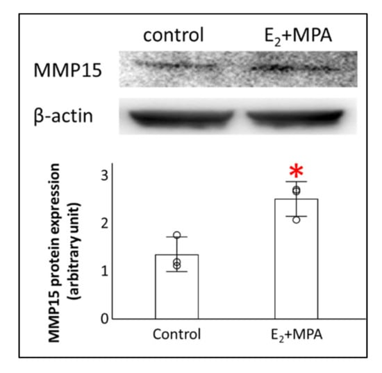 Effect of E2 + MPA treatment on MMP15 proteins in human endometrial stromal cells. Human endometrial stromal cells were treated with E2 (10−8 mol/L) + MPA (10−7 mol/L) (E2 + MPA) or without hormonal treatment (control) for 12 days. The protein expression levels of MMP15 and β-actin were analyzed by immunoblot analysis. MMP15 were normalized to those of β-actin. Values are shown as mean fold change ± SD of independent experiments using cells derived from different patients (n = 3). Each dot indicates the value for different cell preparations. An asterisk indicates statistically significant differences from the control group, * p < 0.05.